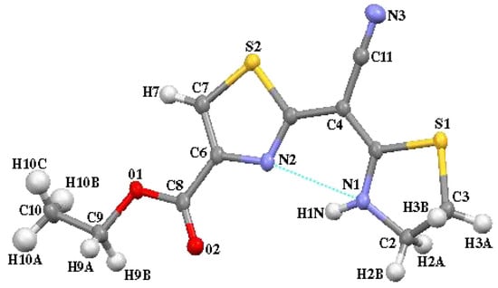 Ethyl 2-((E)-cyano(thiazolidin-2-ylidene)methyl)-4-methylthiazole-5 carboxylate (5f): mp 253-255 °C; IR (KBr): 3,443, 2,190, 1,706, 1,562 cm-1; 1H-NMR (DMSO-d6) δ: 1.26 (t, J = 7.1 Hz, 3H, CH2CH3), 2.60 (s, 3H, CH3), 3.57 (t, J = 7.6 Hz, 2H, SCH2), 4.06 (t, J = 7.6 Hz, 2H, NCH2), 4.16 (q, J = 7.1 Hz, 2H, OCH2), 10.13 (s, 1H, NH); MS (70 eV) m/z: 295 (M+); Anal. Calcd. for C12H13N3O2S2: C, 48.80; H, 4.44; N, 14.23; S, 21.71. Found: C, 48.76; H, 4.27; N, 14.05; S, 21.77.