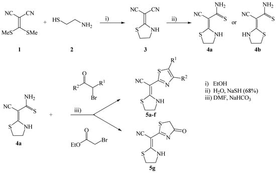 2-(E)-Cyano(thiazolidin-2-ylidene)thiazoles 5a-g were prepared in a three-step procedure starting from the dinitrile 3 (Scheme 1). Cyclocondensation of 2-[bis(methylthio)methylene]malononitrile (1) and cysteamine (2) in ethanol afforded thiazolidine 3, which was filtered off and thionated by sodium hydrosulfide hydrate in water to give 2-cyano-2-(thiazolidin-2-ylidene)ethanethioamide (4) that can form either E and/or Z geometric isomers 4a,b.