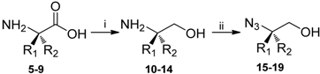 (i) LiAlH4, THF, 16 h, reflux. (ii) TfN3, DMAP, DCM, 15 h, RT.