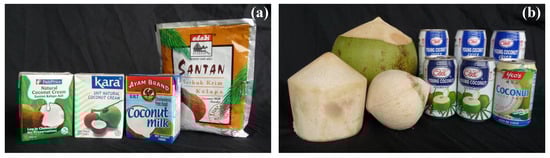 Foods and beverages made from coconut: (a) coconut milk and dried coconut milk powder; (b) canned coconut water/juice and trimmed young coconuts.