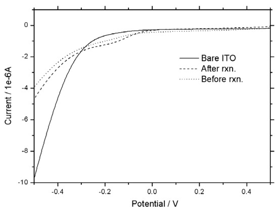 As transmission electron microscope (TEM) and cyclic voltammograms (CVs) studies prove, the structure of the CuO hollow nanospheres on acetylene black (CuO/AB) remained unchanged after the reaction, which is demonstrating catalyst recyclability (Figure 2). CV were measured by using CHI 405A (CH Instruments). 70 μL of a CuO in ethanol was dropped to ITO electrode. After 3 h, the signal of the reduced CuO on ITO was measured via linear sweep voltammetry. The linear sweep was voltamogram obtained at CuO ITO electrode in 10 mM tris buffer (pH 7.4) at scan rate of 50 mV/s.