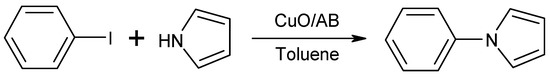 The N-arylation of iodobenzene (0.17 mL, 1.5 mmol) and pyrrole (0.15 mL, 2.25 mmol) with CuO/AB in toluene (7.0 mL), afforded 1-phenyl-1H-pyrrole. As shown in Table 1, 3.0 mol% CuO/AB in toluene at 180 °C for 8 h gave 1-phenyl-1H-pyrrole in 51% yield (entry 1, Table 1). When the reaction time was increased to 18 h, an 81% conversion was achieved (entry 2, Table 1). The reaction temperature was increased to 180 °C through use of a stainless steel reactor. Furthermore, when 5.0 mol% of the catalyst was used, a 22% yield was achieved at 150 °C for, 8 h (entry 3, Table 1). In general, it was found that increasing reaction temperature and time were effective means of increasing the conversion (59% for 180 °C, 8 h, entry 4, Table 1). Increasing the reaction time and changing the base to KOH, K2CO3, and KOtBu, gave respective, varied yields of 9, 71 and 72% (entries 5, 6, and 7, Table 1). After that, in order to exploit the thermally stable properties of the CuO/AB catalyst, reaction temperature was increased. Placing the reaction in a closed system (stainless steel reactor) at 180 °C and reacting for 18 h achieved a 92% conversion (entry 8, Table 1). Finally, the optimum reaction conditions were achieved: N-arylation of iodobenzene (0.17 mL, 1.5 mmol) and pyrrole (0.15 mL, 2.25 mmol) with CuO/AB (70 mg, 5.0 mol%) in Toluene (7.0 mL) at 180 °C for 18 h to afford 1-phenyl-1H-pyrrole. In addition, under optimum reaction conditions, no reaction occurred without a catalyst. It was also observed via NMR, TLC and column chromatography that no side products, such as Ar-Ar coupling products, were formed. Remarkably, after the reaction, the CuO on AB as separated by centrifugation and could be reused ten times under the same reaction conditions, without any loss of catalytic activity; the maximum reusability has not yet been tested. These results confirm that the catalytic system presented herein satisfies the conditions for heterogeneous catalysts of ease of separation, recyclability, and persistence.