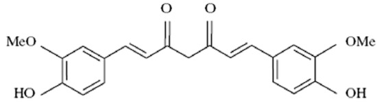 Curcumin is a natural pigment derived from turmeric (Curcuma longa L.), which has been known for its numerous pharmacological properties for many years [1,2,3]. It has the advantage of being nontoxic towards normal cells [4]. Traditionally, curcumin has been used as a coloring, food preservative and flavoring substance (Figure 1).