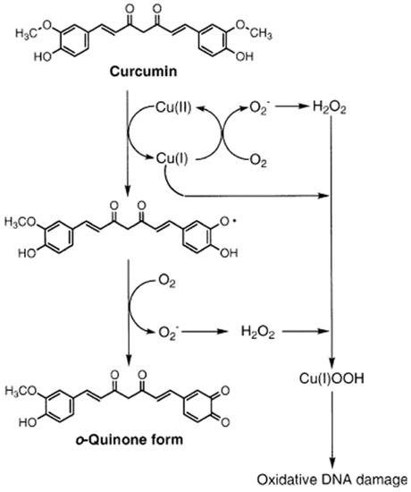 DNA damage represents a crucial step in carcinogenesis, and the restoration of the DNA damage response is a promising strategy both to prevent cancer development and to improve response to conventional therapy [9]. The prooxidant action of plant-derived phenolics rather than their antioxidant action may play an important role in their anticancer and apoptosis-inducing properties [10]. Curcumin is a polyphenol [11], which can generate reactive oxygen species as a prooxidant agent in the presence of copper ions in cells, resulting in DNA damage and apoptotic cell death [12]. A possible mechanism of DNA damage induced by curcumin in the presence of Cu (II) was reported [13] and is shown in Figure 2.