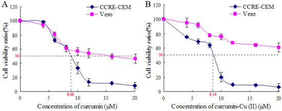 Effects of curcumin and curcumin-Cu (II) on the viability of CCRF-CEM and Vero cells as determined by the MTT assay. A: Treatment with curcumin; B: Treatment with curcumin-Cu (II). The values for each concentration tested represent the average (mean ± SD) from eight replicate wells and are representative of three separate experiments.