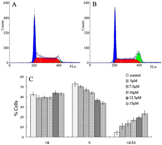 Cell cycles distribution of CCRF-CEM cells after treatment with different concentrations of curcumin for 48 h. Flow cytometric analysis of CCRF-CEM cell cycle distribution, (A) Untreated control cells; (B) Cells treated with 15 μM curcumin; (C) The results were analyzed by Mod Fit LT 3.0. Data are presented as mean ± SD (n = 3). **p < 0.01, *p < 0.05; p value compared with the control group (0 μM).