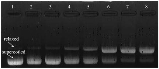 Agarose gel electrophoretic patterns of plasmid DNA treated with curcumin in the presence of Cu (II) ions (0.2 mM). pBR322 plasmid DNA (0.5 μg) was incubated for 1 h at 37 ºC in the presence of the following additives: lane 1, no addition (DNA control); lane 2, 0.2 mM curcumin without copper; lane 3, copper without curcumin; lanes 4–8, copper plus curcumin at different concentrations, 0.01, 0.025, 0.05, 0.1, and 0.2 mM, respectively.