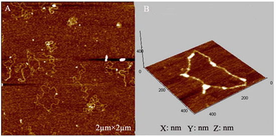 Untreated pBR332 DNA plasmid. A: Two-dimensional representation. Size = 2 µm × 2 µm; B: Three-dimensional representation. Size = 400 nm × 400 nm × 400 nm.