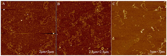 AFM imaging of pBR332 DNA plasmids treated with curcumin and/or Cu (II). A: Plasmid 0.05 µg plus 0.02 mM Cu (II) for 2 h; B: Plasmid 0.05 µg plus 0.02 mM curcumin for 2 h; C: Plasmid 0.05 µg plus 0.02 mM Cu (II) plus 0.02 mM curcumin for 2 h.