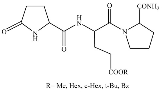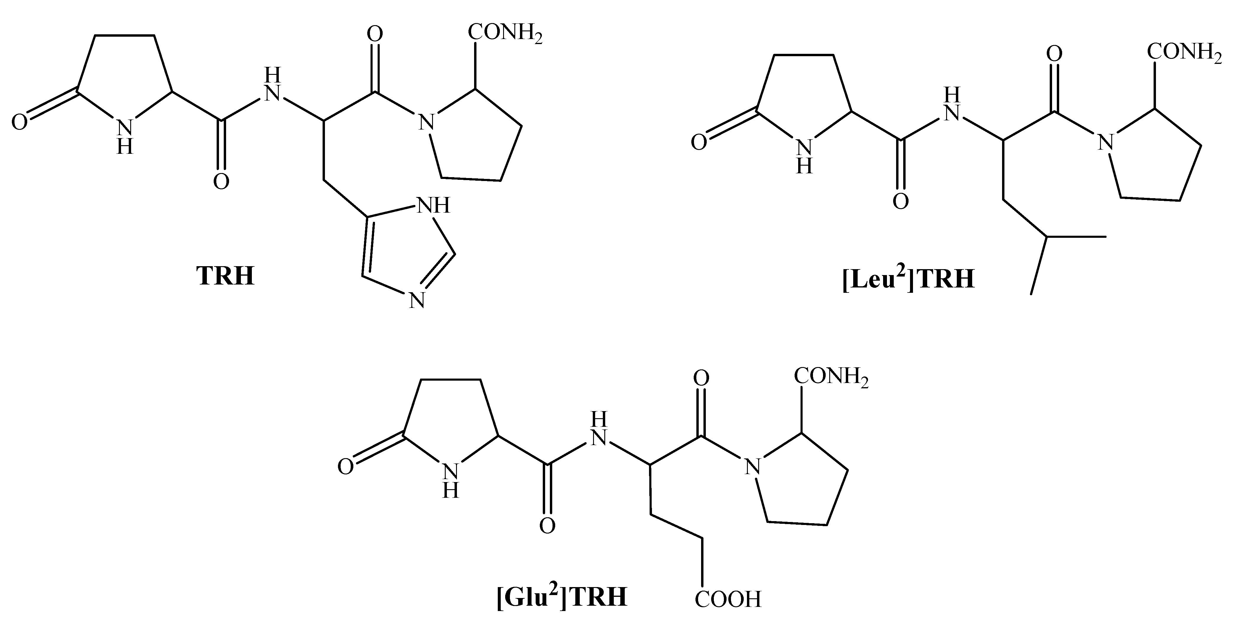 - Szirtes, T.L.; Kisfaludi, L.; Palosi, E.; Szporny, L. Synthesis of Thyrotropin-Releasing Hormone Analogues. 1. Complete Dissociation of Central Nervous System Effect from Thyrotropin-Releasing Activity. J. Med. Chem. 1984, 27, 741–745. [Google Scholar] [CrossRef]