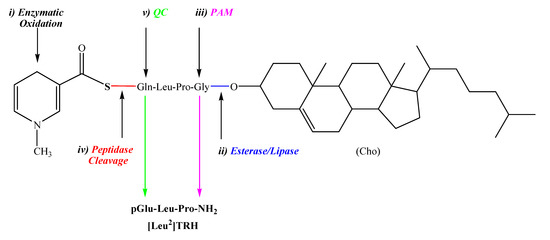 A centrally selective natural analogue of TRH is [Leu2]TRH (pGlu-Leu-Pro-NH2, Figure 1) [42], in which the central His of TRH is replaced with Leu. Compared to TRH, [Leu2]TRH shows an approximately 2.5-fold increase in typical TRH-associated analeptic effect and 50-fold decrease in promoting TSH release [43]. Therefore, we selected this tripeptide for substantiating our brain-targeting prodrug approach [25]. Nevertheless, [Leu2]TRH possesses a profound peptide character such as poor lipophilicity (logP = –1.67) that prohibits significant transport across the BBB. The amino- and carboxy-termini of [Leu2]TRH are not suitable for direct bioreversible derivatization to create a lipophilic prodrug by our approach; however, we envisioned that (by the analogy of TRH biosynthesis [44]) Gln-Leu-Pro-Gly would be a suitable progenitor sequence for [Leu2]TRH. Specifically, it was expected that peptidyl-a-hydroxy-glycine (PAM, [45]) would convert the carboxy-terminal Gly to Pro-NH2 and glutaminyl cyclase (QC [46]) would eventually produce pGlu from Gln by using this progenitor sequence. A “transport moiety” (1,4-dihydrotrigonellyl, Dht, residue) [26] for the prodrug creation was attached through strategically selected [47,48] scissile linkers (S) to the amino-terminus of the Gln-Leu-Pro-Gly progenitor sequence [25], as shown in Figure 2. Dht is expected to be oxidized to pyridinium (trigonellyl, Trig; the residue of N-methylnicotinic acid) in the brain analogously to that of NAD(P)H to NADP+ and, therefore, the resultant “oxidized prodrug” is captured inside the brain due to its ionic nature. To furnish lipophilicity to the prodrug for BBB transport, its carboxy-terminus was esterified with highly lipophilic alcohols such as cholesterol (Cho). The idea behind this design was that [Leu2]TRH is eventually formed in the brain after a well-orchestrated sequence of enzymatic processes (i to v, Figure 2).