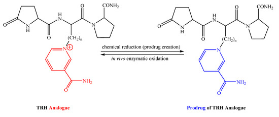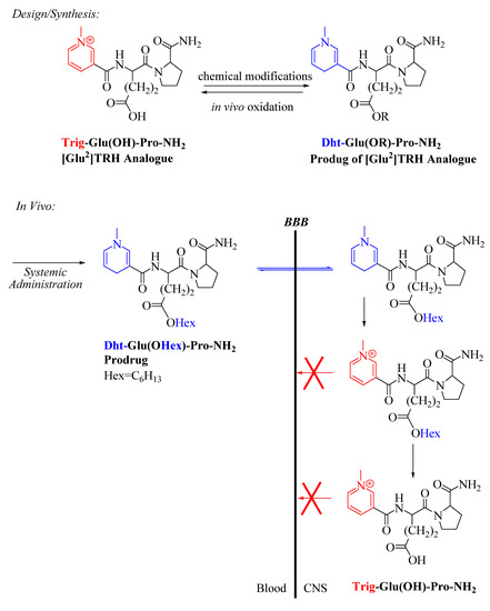 - Prokai, L.; Prokai-Tatrai, K.; Ouyang, X.; Kim, H.S.; Wu, W.M.; Zharikova, A.D.; Bodor, N. Metabolism-Based Brain-Targeting System for a Thyrotropin-Releasing Hormone Analogue. J. Med. Chem. 1999, 42, 4563–4571. [Google Scholar] [CrossRef]