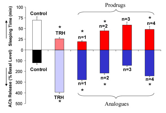 For the development of brain-targeting prodrug strategies involving neuropeptides we have studied most extensively thyrotropin-releasing hormone (TRH, pGlu-His-Pro-NH2) and its analogues (Figure 1) as models for neuropeptides with poor access to the CNS [28]. In this review, we summarize the most important developments our laboratory has achieved in this field in the last 10 years. TRH and structurally related endogenous peptides (Figure 1) have been considered lead compounds for developing useful CNS agents [29]. This small peptide was the first hypothalamic releasing factor characterized, establishing the fundamental proof for the existence of a neuroendocrine regulation of pituitary functions by hypothalamic neuronal structures [30,31]. A variety of behavioral effects are induced by its peripheral and central application [32]. Therefore, it has been implicated in the management of various neurological and neuropsychiatric disorders such as depression, epilepsy, brain injury, Alzheimer’s disease and schizophrenia, as well as stimulation of spinal-cord motorneurons. TRH has been successfully used for treating children with neurological disorders including epilepsy conditions intractable to anticonvulsants and adrenocorticotrophic hormone, mostly in Japan [33]. The best-known neuropharmacological effect of TRH is its analeptic action [34,35], which is frequently exploited for testing TRH-based compounds in early-phase development [29]. High doses administered peripherally and lower doses administered into specific brain regions, have been shown to significantly reduce pentobarbital-induced sleeping time in rats, rabbits and monkeys. The analeptic effects of TRH appear to be mediated by a cholinergic mechanism [36,37].