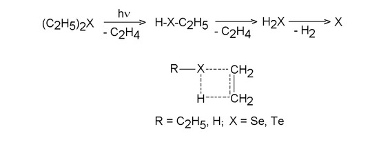 - Pola, J.; Ouchi, A. UV Laser-Induced Photolysis of Diethyl Selenium and Diethyl Tellurium: Extrusion of Selenium and Tellurium via Molecular Elimination of Ethene. J. Organometal. Chem. 2001, 629, 93–96. [Google Scholar] [CrossRef]
