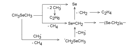- Didenkulova, I.I.; Dyagileva, L.M.; Tsyganova, E.I.; Alexandrov, Yu.A. Kinetics of Gas-Phase Pyrolysis of Dimethyl Selenide. Zh. Obshch. Khim. 1984, 54, 2288–2290, [Chem. Abstr. 102:45357m]. [Google Scholar]