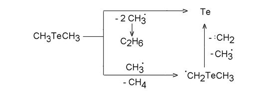 - Yablokov, V.A.; Dozorov, A.V.; Zorin, A.D.; Feshchenko, I.A.; Ronina, O.V.; Karataev, E.N. Kinetics of Gas-Phase Pyrolysis of Dimethyl Telluride and Dimethyl Selenide. Zh. Obshch. Khim. 1986, 56, 1751–1754, [Chem. Abstr. 1987, 106, 213284q]. [Google Scholar]