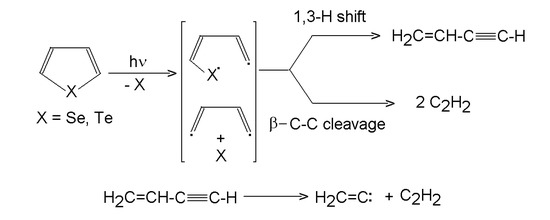 - Pola, J.; Ouchi, A. ArF and KrF Laser-Induced Gas-Phase Photolysis of Selenophene and Tellurophene: Extrusion of Te and Se and Intramoleculr 1,3-H Shift Competing with b-C-C Bond Cleavage in C4H4 residue. J. Org. Chem. 2000, 65, 2759–2762. [Google Scholar] [CrossRef]