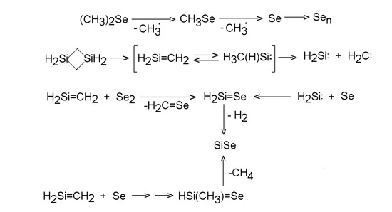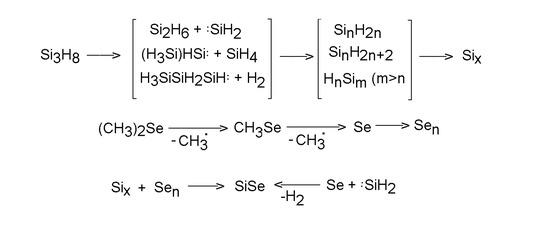 - Santos, M.; Díaz, L.; Urbanová, M.; Bastl, Z.; Šubrt, J.; Pola, J. IR Laser-Induced Co-Decomposition of Dimethyl Selenide and Trisilane: Gas-Phase Formation of SiSe and Chemical Vapor Deposition of Nanostructured H/Si/Se/C Polymers. J. Photochem. Photobiol. A 2007, 188, 399–408. [Google Scholar] [CrossRef]