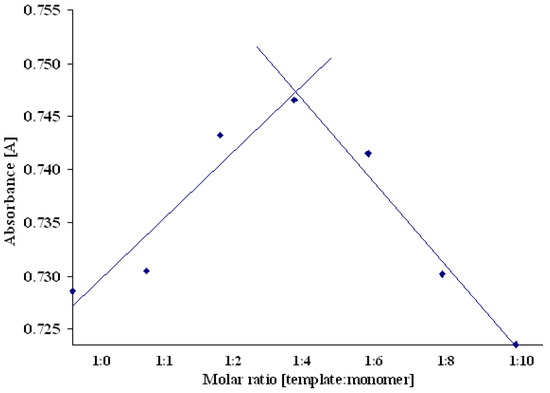 Job’s plot presenting the relations between absorbance and molar ratio of template to functional monomer.
