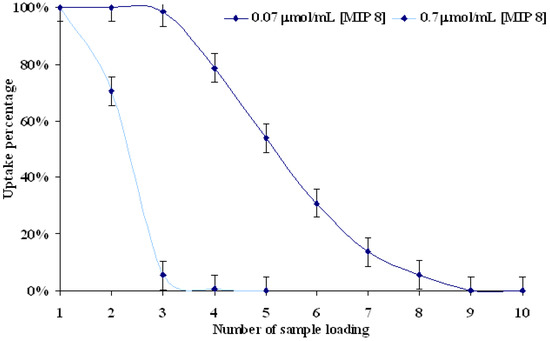 The first experiment was performed for two different concentrations of aqueous standard solutions: 0.7 and 0.07 μmol/mL in dynamic procedure. Successive portions (1 mL) of both standard solutions were put on matrices. The saturation of polymer matrix by molsidomine was considerably different in both 0.7 and 0.07 μmol/mL solutions. Complete saturations came after 9 and 4 portions for 0.07 and 0.7 μmol/mL solutions, respectively. Total amounts of molsidomine adsorbed from 0.7 μmol/mL solution were 11.79 μg/mg for MIP8 and 11.57 μg/mg for NIP8, and from 0.07 μmol/mL solution were 3.17 μg/mg for MIP8 and 3.12 μg/mg for NIP8. The percentage of molsidomine bound by MIP8 and NIP8 is reported in Figure 5.