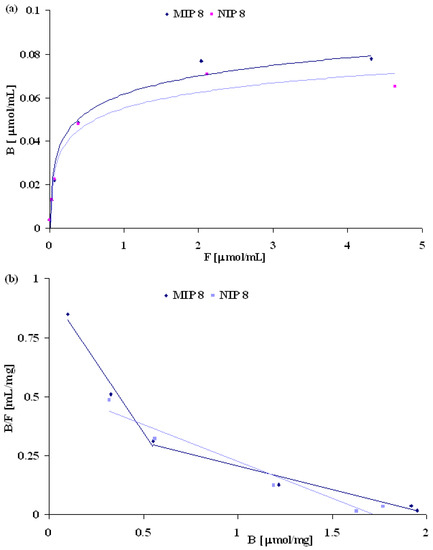The binding characteristic of MIP8 and NIP8 was also estimated by Scatchard plots represented by the equation B/F = (Bmax – B)/Kd, where Kd is the dissociation constant and Bmax is the maximum amount of binding sites. The concentrations of free (F) and bound (B) molsidomine were determined by measuring the unbound fraction in the solution [18,19]. The binding isotherms were determined in water solutions by adding a fixed amount of polymer to the various concentrations of molsidomine (0.01 to 6 μmol/mL) (Figure 6a). Only a slight difference in binding properties between MIP8 and NIP8 was noted. However, Scatchard plots presented in Figure 6b revealed two straight lines for MIP8, and only one such line for NIP8. This result is typical of imprinted polymers obtained by the non-covalent approach. Polymer MIP8 has two classes of heterogeneous binding sites characterized by two Kd and two Bmax: Kd(1) = 1.17 mM-1 and Bmax(1) = 0.8 μmol/mg for the higher affinity binding sites, and Kd(2) = 200 μM-1 and Bmax(2) = 2.05 μmol/mg for the lower affinity binding sites.