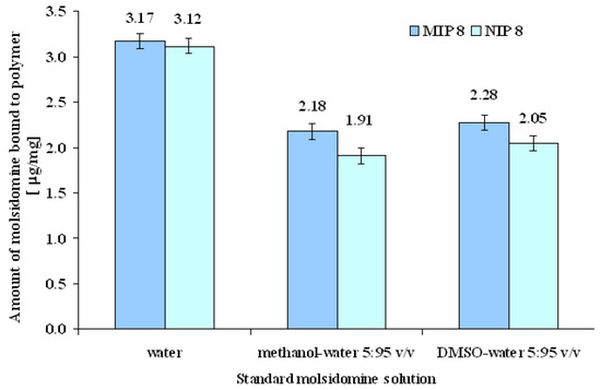Additionally, evaluation of the capacity of MIP8 and NIP8 to recognize the template was performed in water at pH = 3.0 and pH = 7.0, in methanol-water and DMSO-water at molsidomine concentration of 0.07 μmol/mL. As stated above, the first binding experiments were performed in aqueous media (see Experimental, subsections c and e). The small difference between the quantity of molsidomine bound to MIP8 and NIP8 was explained by non-specific binding of molsidomine in water. Unfortunately, comparable small imprinting factors were obtained both in aqueous media at pH 3.0 as well as at pH 7.0. The tested range of pH values was limited by the stability of molsidomine [10]. Next, the binding of MIP8 was tested by performing the same experiments in methanol-water (5:95 v/v) and in DMSO-water (5:95 v/v). The results are shown in Figure 7.