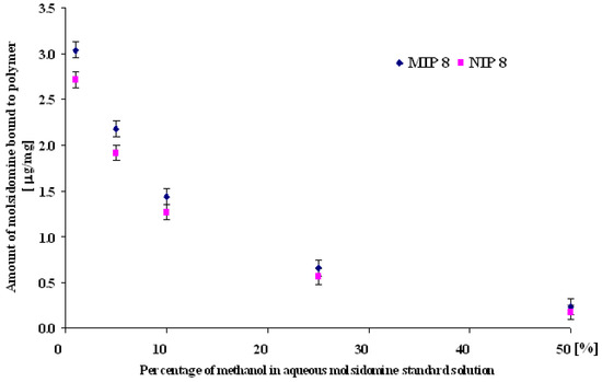 Amount of molsidomine bound to MIP8 and NIP8 in methanol-water solutions.