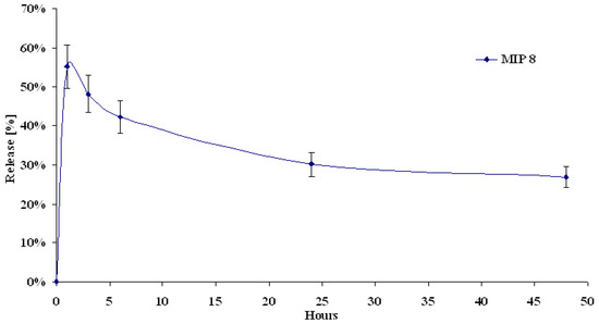 Next, we investigated the release characteristic of MIP8 when the total volume of the releasing medium was exchanged. The release profile was presented as percentage of the initial amount of molsidomine (Figure 10).