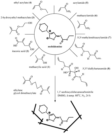 The template molecule, subsequent functional monomers, the cross-linker and initiator were dissolved in DMSO (Scheme 1) in a thin-walled glass tube. DMSO was chosen as a porogen due to the low solubility of molsidomine and functional monomers in many organic solvents. Molsidomine is soluble in DMSO and chloroform and practically insoluble in other organic solvents, whereas some monomers are insoluble in chloroform. The molar ratio of template to functional monomer and cross-linker was 1:4:16. The obtained solution was purged with nitrogen, the glass tube was sealed and incubated at 88 oC for 24 h. Non-imprinted polymers were prepared in the same way, except the addition of template.