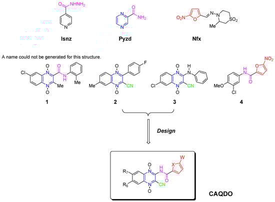 The new developed CAQDOs were subjected to the following set of tests: i) determination of the MICs, in μg/mL, against M. tuberculosis H37Rv strain and, ii) determination of the percentage of growth inhibition, at 25 μM, and IC50 values, in μM, against T. cruzi Tulahuen 2 strain (Table 1).
