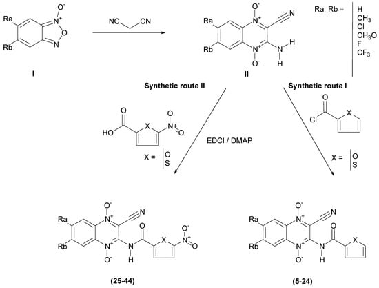 We have prepared forty new heterocyclic-2-carboxylic acid (3-cyano-1,4-di-N-oxidequinoxalin-2-yl)-amide derivatives (CAQDOs). The benzofuroxane starting compounds, (BFX, I, Scheme 2), have been prepared using previously described methods [11,22]. The 3-amine-1,4-di-N-oxide quinoxaline-2-carbonitrile derivatives (cyanoamines, II) were obtained by the Beirut reaction from the corresponding BFX, with malononitrile using N,N-dimethylformamide (DMF) as solvent and triethylamine as catalyst [23]. Finally, the new CAQDOs were synthesized using two different routes, I and II (Scheme 2) [4,24]. Furyl and thienyl derivatives 5-24 were obtained by reaction between intermediates II with an excess of the corresponding, commercially available, heteroaryl-2-carbonyl chloride. Another synthetic route was optimized for the synthesis of 5-nitrofuryl and 5-nitrothienyl derivatives 25-44. In these cases, the reaction was carried out by condensation between intermediates II and the corresponding carboxylic acid, 5-nitrofuryl and 5-nitrothienyl carboxylic acid, activated in the presence of EDCI and DMAP and DMF as solvent.