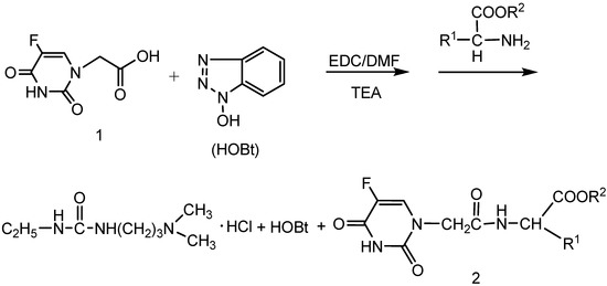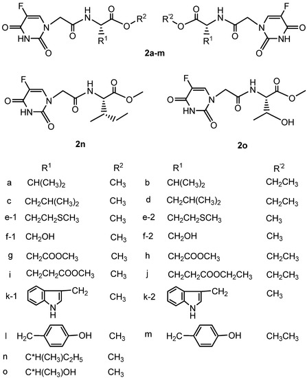 The synthetic route to the target compounds 2a-o is shown in Scheme 1 and Figure 1. The starting material 2-(5-fluoro-2,4-dioxo-3,4-dihydropyrimidin-1(2H)-yl) acetic acid (or 5-fluorouracil-1-yl acetic acid) (1) could be easily prepared by carboxymethylation of 5-fluorouracil according to the literature [17]. Treatment of compound 1 with a series of amino acid esters using 1-ethyl-3-(3-dimethylamino-propyl)carbodiimide hydrochloride (EDC·HCl) and N-hydroxybenzotriazole (HOBt) as a coupling agent yielded a series of 2-(5-fluoro-2,4-dioxo-3,4-dihydropyrimidin-1(2H)-yl)-aceto amino acid ester derivatives 2. HOBt was reported as a racemisation suppressant in peptide coupling reactions with carbodiimide coupling reagents [18,19,20].