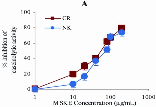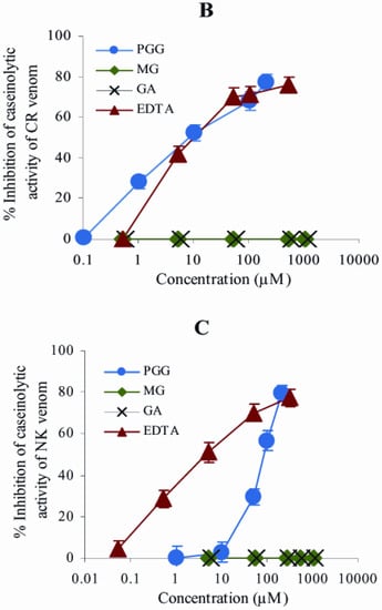 From the in vitro test, the initial caseinolytic doses of CR and NK venoms obtained from the plot between venom doses and their caseinolytic activity were 50 and 500 µg, respectively. Figure 1 demonstrates that MSKE, its major phenolic principle (PGG) and EDTA inhibited the caseinolytic activity of both venoms in a concentration−dependent manner. The effective concentrations (EC50s) of the extract at which 50% of the caseinolytic activity of CR and NK venoms was inhibited were 58.2 ± 2.4 and 75.8 ± 2.1 μg/mL, respectively, (Figure 1A).