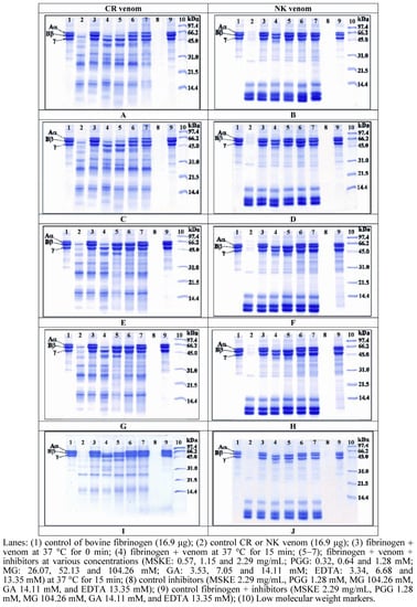In vitro inhibition of fibrinogenolytic activity of CR (left) and NK (right) venoms by MSKE (A and B), PGG (C and D), MG (E and F), GA (G and H), and EDTA (I and J).