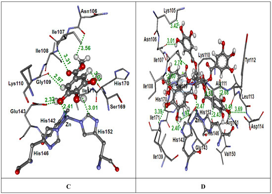 It can be seen from Figure 3 and Figure 4 that the tannin principles of MSKE formed hydrogen bonds with the three active histidine residues in the conserved zinc−binding motif (HEbxHxbGbxHD) of the SVMPs from CR and NK venoms. These active histidine residues are involved in the binding of the catalytically essential zinc ion; if the inhibitors are bonded to these residues the SVMPs catalytic efficiency can be changed [24]. Furthermore, the tannins of MSKE also form important chemical bonds with the Zn2+ atom of both SVMPs. Therefore, the results of molecular docking indicated that the phenolic molecules of MSKE could selectively bind to the conserved zinc−binding sites that are critical to the catalysis of SVMPs. In addition, this study found that the phenolic molecules of MSKE can chelate Zn2+ atoms and it is well known that SVMPs depend on metal ions (especially Zn2+ and Ca2+) to exert theirs action. These results were in accordance with those of Nithitanakool et al. [21] who found that MSKE was a natural chelator. Since SVMPs have been considered as the key toxins involved in snake venom−induced pathogenesis, example of hemorrhage, edema, hypotension, hypovolemia, inflammation and necrosis [3]; we can confirm from our results the presence of a selective mechanism for MSKE against the activity of SVMPs in CR and NK venoms. In addition, these results supported our previous findings which demonstrated the inhibitory activities of MSKE against hemorrhagic and dermonecrotic activities of CR and NK venoms in mice and rats, respectively [18].