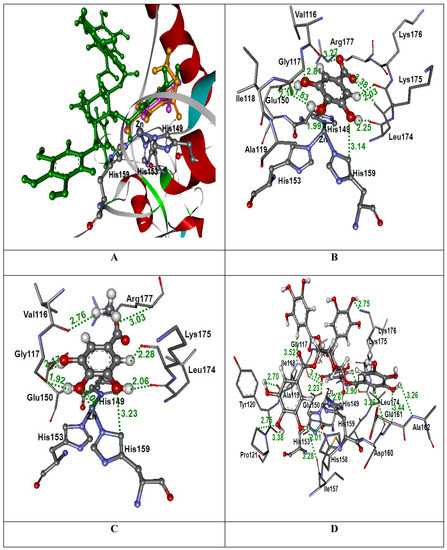 The docked conformations of GA, MG and PGG in the kaouthiagin (P−III SVMP) binding pocket of NK venom are shown in Figure 4. The GoldScores of GA, MG, and PGG are 47.70, 48.70, and 76.45, respectively (Table 1). The GoldScores revealed that PGG was bound tighter than GA and MG in its binding pocket in NK venom. The binding orientations of GA, MG and PGG in the kaouthiagin are shown in Figure 4A. The docked GA conformation (Figure 4B) was located at a similar position to that of the docked MG conformation (Figure 4C) and the Ring C position of the docked PGG conformation (Figure 4D). The O10 atom of docked GA and MG conformations revealed an interaction with Zn2+ atom (1.99 Å and 2.67 Å, respectively) and H−bond interactions were also found with Gly117, His149, Glu150, His159, Leu174, Lys175, and Arg177. A hydrogen atom of a methyl group of the docked MG conformation formed an H−bond interaction with Val116. In the case of docked PGG conformation, the Ring C revealed the same H−bond interaction as shown in the docked GA and MG conformations; i.e. Gly117, His149, Glu150, His159, Leu174, Lys175, and Arg177. The O28 atom of docked PGG conformation was found to interact with Zn2+ atom (2.67 Å). The other parts of the docked PGG conformations were formed the H−bond interactions with Val116, Ile118, Ala119, Tyr120, Pro121, Ile157, His158, Asp160, Glu161, Ala162, and Lys176.