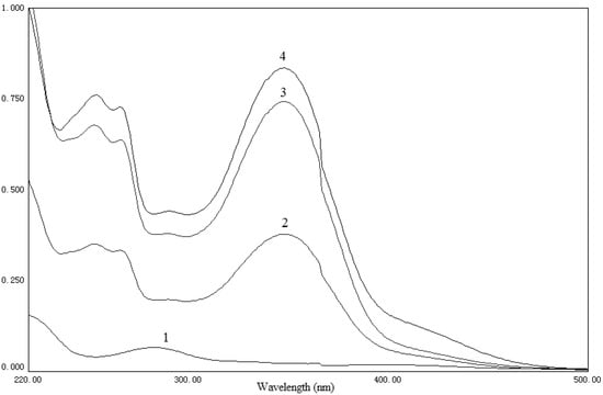 UV spectra of phospholipid (1), physical mixture of luteolin and phospholipid (2), luteolin-phospholipid complex (3) and luteolin (4).
