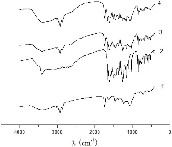 IR spectra of phospholipid (1), luteolin (2), physical mixture of luteolin and phospholipid (3), luteolin-phospholipid complex (4).