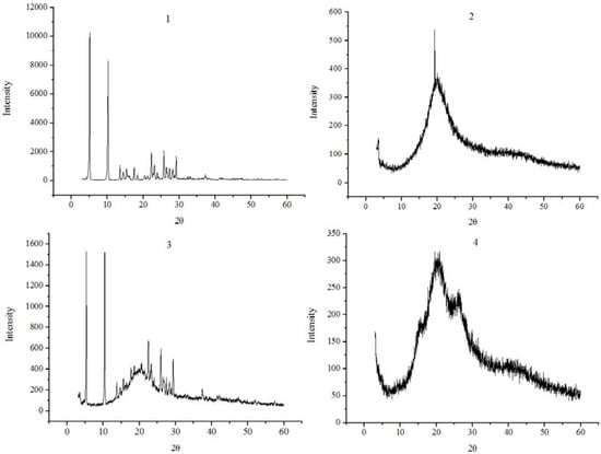 X-ray diffraction patterns of luteolin (1), phospholipid (2), physical mixture of luteolin and phospholipid (3), luteolin-phospholipid complex (4).