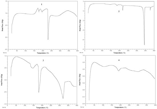 DSC curves of luteolin (1), phospholipid (2), physical mixture of luteolin and phospholipid (3), luteolin-phospholipid complex (4).