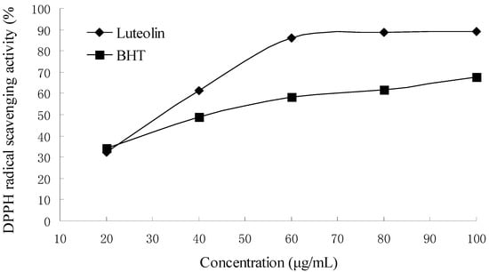 The DPPH radical is a stable organic free radical with an adsorption band at 517 nm. It loses this adsorption when accepting an electron or a free radical species, which results in a visually noticeable discoloration from purple to yellow. In this study, the high DPPH radical scavenging activity of BHT and the complex was observed in a concentration dependent manner (Figure 6). The complex (IC50, 28.33 μg/mL) was more active than BHT (IC50, 42.62 μg/mL). The high DPPH radical scavenging activity of the complex is attributed to the presence of luteolin.