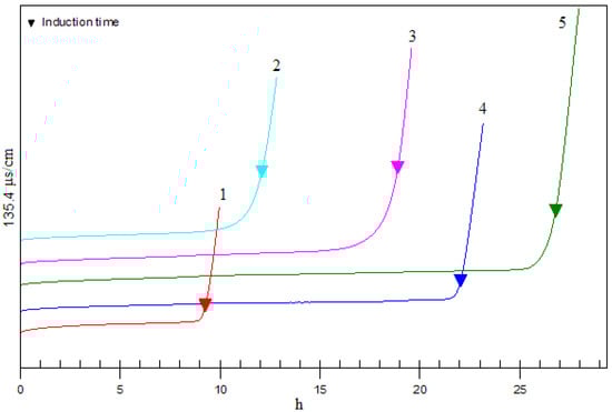 Rancimat antioxidant activity of antioxidant activity of control (1), 0.02% complex (2), 0.04% complex (3), 0.02% BHT (4) and 0.06% complex (5).