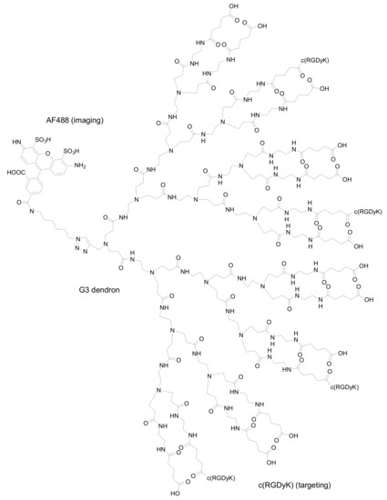 In another recent example, Baker and co-workers described the synthesis and evaluation of in vitro biological activity of poly(amidoamine) (PAMAM) dendrons with c(RGDyK) peptides on their surfaces. A unique alkyne group present at the dendron focal point was reacted with an azide-functionalized dye [derivatized Alexa Fluor (AF) 488] via 1,3-dipolar cycloaddition thus generating a fluorescent high avidity binding agent (Figure 5) [24]. AF488 was chosen as the fluorescent label for the detection of conjugates as it is brighter than fluorescein and more resistant to photobleaching. The specific binding of the conjugate to αvβ3 integrin expressing HUVEC and U87MG cells was examined by flow cytometry. The alkyne functionalized dendron was also conjugated to biotin, to a second dye-conjugated dendron and to methotrexate, a therapeutic drug, using the appropriate azide-derivatized molecule.