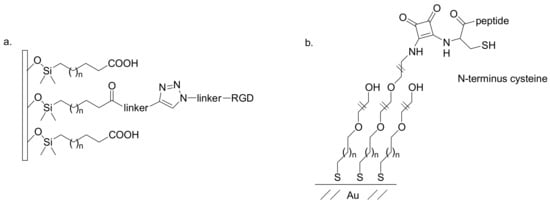 RGD-containing peptide immobilized onto silicon surface (a) and N-terminus cysteine immobilization on phenoxy-squarate SAM (b).