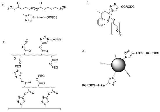The previuos examples have demonstrated that the incorporation of the RGD sequence onto a polymer or a substrate is a quick method to produce innovative materials able to promote cell adhesion and growth. The following examples will extend to the usefulness of click chemistry for other types of functionalized materials and in particular the use of CuAAC as a successful way to introduce the well-recognized adhesive RGD motif.