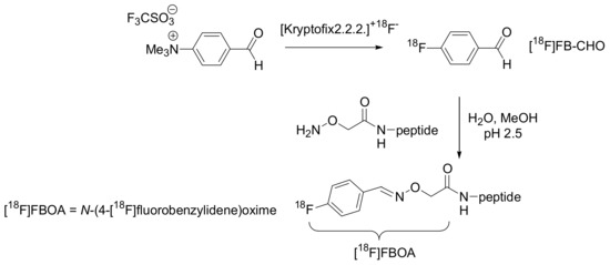 Kessler described in detail the solid phase synthesis of peptides containing the cyclo-RGDfE sequence, appropriately linked to the aminooxy functionality required for the chemoselective oxime ligation. The subsequent coupling of these peptides with p-trimethylstannylbenzaldehyde afforded useful precursors for radioiodostannylation (Figure 2) [14]. The advantages of this methodology were then used by the same authors for the efficient synthesis of 18F-labelled peptides [15]. 18F is an important source of positrons and it represents the ideal radionuclide for PET. 18F-labelled target specific peptides are widely used as in vivo imaging agents but, because of the physical half-life of 18F (109.7 min), it is very important to have in hand a synthetic method which allows the clean and rapid introduction of the radio label. 4-[18F]Fluorobenzaldehyde ([18F]FB-CHO) was prepared from the 4-formyl-N,N,N-trimethylanilium precursor via direct no-carrier-added 18F-fluorination and, after purification, it was coupled to aminooxy-functionalized peptides with an overall radiochemical yield (decay corrected) of up to 40% (Scheme 3).