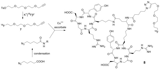 A different synthetic approach for the introduction of the prosthetic group was employed by the group of Chen. In this case, the labelling reaction is based on the Cu(I)-catalyzed Huisgen 1,3-dipolar cycloaddition. The authors prepared a dimeric-cyclo-(RGDyK) peptide labelled with their newly developed 18F synthon as represented in Scheme 6 [18]. Nucleophilic fluorination of the p-toluenesulfonic alkyne provided 18F-alkyne 7 in high yield (65% nondecay-corrected yield) and under mild conditions. The presence of the triethylene glycol linker is necessary to reduce volatility and to obtain water solubility. The azide moiety was introduced on the biomolecule by condensing the glutamate amino group of the cyclo-(RGDyK) dimer with an opportune azide-activated ester. The 1,3-dipolar cycloaddition is an extremely useful method for the introduction of the 18F synthon, considering both the short reaction time (45 minutes including HPLC purification) and the high labelling yield (52 ± 8% nondecay-corrected yield). The 18F-labelled peptide 8 was subjected to microPET studies in murine xenograft models showing good tumor uptake and relatively good metabolic stability as well as favourable in vivo pharmacokinetic.