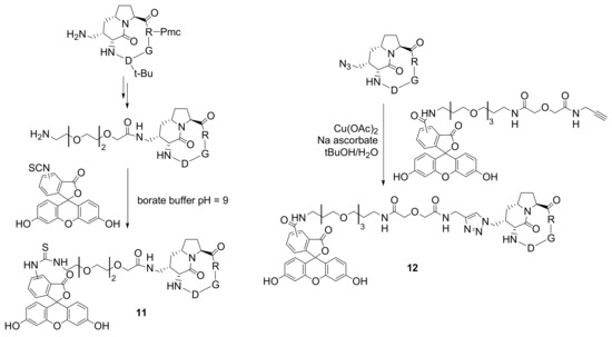 Another important method used for in vivo imaging is the introduction of fluorescent dyes. Manzoni and co-workers have recently reported the synthesis of two cycloRGD peptide-fluorescein conjugates 11 and 12 that could be used as in vivo markers for αvβ3-integrin expression in human cells [23]. The green fluorescent dye fluorescein is widely used as a probe due to its known safety profile. Two different synthetic strategies were used by the authors for the conjugation with fluorescent probes of cyclic RGD compounds containing the conformationally constrained homoSer-Pro dipeptide unit. The first strategy involved the functionalization of the RGD cyclopeptide with a short poly(ethylene glycol) spacer armed with a terminal amine group and able to form a stable thiourea bridge with commercially available fluoresceine isothiocyanate, through an efficient click carbonyl chemistry reaction. The second approach required the preparation of a fluorescent derivative with a terminal triple bond that can be directly reacted with the azide group of the RGD cyclopeptide through the copper-catalyzed 1,3-dipolar cycloaddition (Scheme 9).