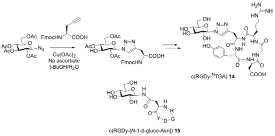 The preparation of a glycosylated RGD derivative in order to evaluate the value of a triazole moiety as an amide isostere in terms of electronic properties and atom placement has been recently described by Rutjes and co-workers [28]. The authors showed that 1-azido sugars and acetylene-modified amino acids readily undergo [3+2] cycloaddition to form triazole isosters of glycoamino acids (Scheme 12). The obtained glycosylated amino acid was used as a building block in the following solid phase synthesis of the cyclic peptide c(RGDy-NTGA) 14.
