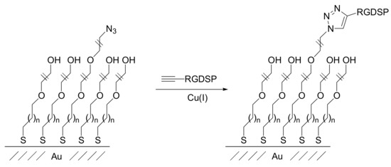 - Hudalla, G.A.; Murphy, W.L. Using “click” chemistry to prepare SAM substrates to study stem cell adhesion. Langmuir 2009, 25, 5737–5746. [Google Scholar] [CrossRef] [PubMed][Green Version]